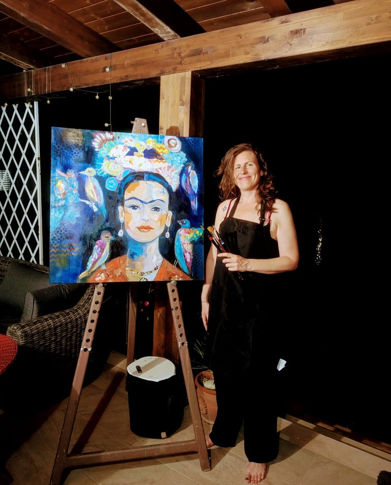 Isabel Einsiedl hat außerdem Wandmalereien und Raumgestaltungen im Hotel umgesetzt. Dazu gehört u. a. ein Yoga-Raum, den sie mit großformatigen Arbeiten ausgestattet hat – darunter ein Werk mit dem Titel Frida Look Flower Girl, das sie in einem Speedpainting-Prozess dokumentierte.